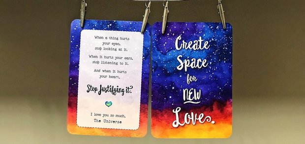 The front of the card said: When a thing hurts your eyes, stop looking at it. When it hurts your ears, stop listening to it. And when it hurts your heart, stop justifying it. I love you so much, The Universe
